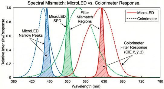 MicroLEDは非常に狭帯域なピーク特性を持つ一方で、色彩計のフィルタ応答は広帯域特性を有します。