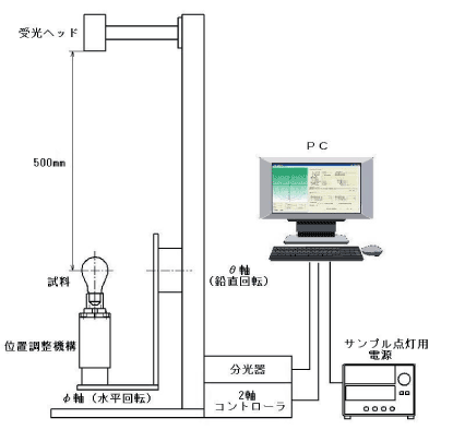 中型配光測定システムOP-GONIO-VIS-SR500はLED素子等のサイズの小さなものから、口金E26サイズの電球型まで幅広いサイズのサンプルに対応した中型の配光測定システムです。サンプルを水平方向(φ)と鉛直方向(θ)の2軸制御を行い、自動かつ簡易的にサンプルの配光測定を行う事が可能です。また、検出器には高感度の電子冷却式裏面入射型分光器を採用しているので、配光分布だけではなく分光放射照度スペクトル、全光束、色測定まで行う事ができます。